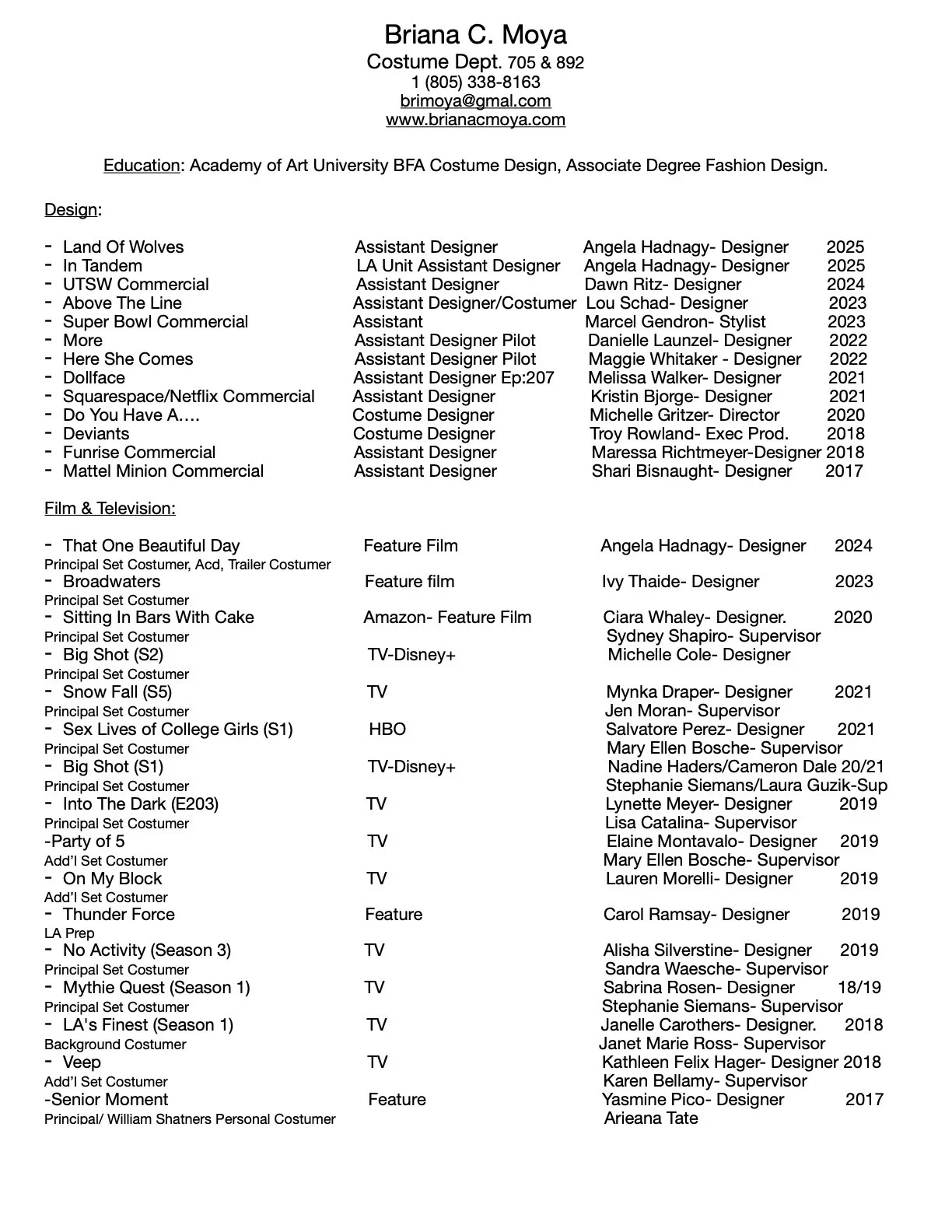 Briana was educated at the acclaimed Academy of Art University in San Francisco, graduating top of her department with an Associate’s degree in Fashion Design and a Bachelor of Fine arts in Costume Design for Film, Television & Theater. She has studied and aspires to Design period Costumes for Film and Television in the United States and United Kingdom someday. For the moment she lives and works in Los Angeles California as a Local 705 Costumer And 892 Assistant Costume Designer.